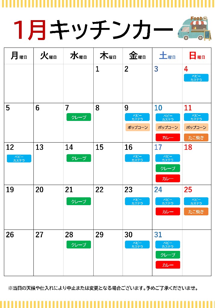 1月のキッチンカースケジュールです。 ・ ・ ランチ・テイクアウトにご利用ください。 ・ ・